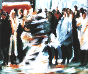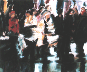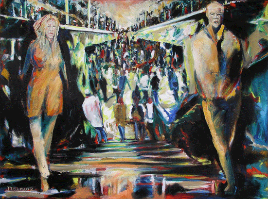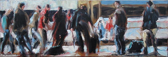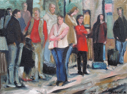 Auf dem Bahnsteig gibt es tausende von Reisenden. Wartend auf den Zug sind sie mir Modell. Sie wollen schnell weg, doch sie sind gezwungen zu verharren. Dieses Spannungsmoment zwischen Geschwindigkeit und Stillstand lässt das Individuelle hervortreten und ich kann mir das eigene Warten vertreiben.